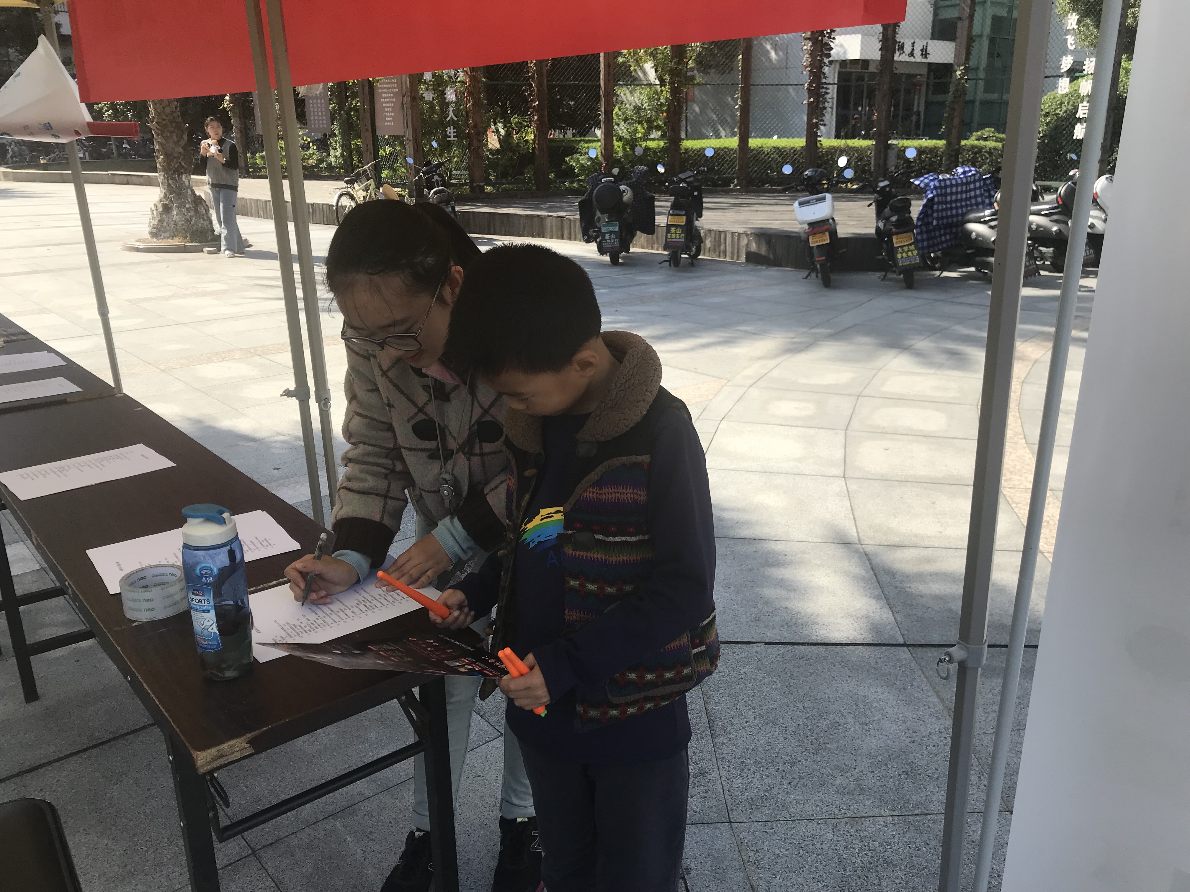 首先是在C区开展活动,在搭建好帐篷与易拉宝并且安置好桌椅后,志愿者们便纷纷动身前往C区各处分发宣传单和调查问卷,并讲解禁毒安全知识。其中有一名老师向志愿者发出提问,志愿者对其进行耐心的解答,并比较了各地吸毒人群占比的情况,最终得到了老师与周围同学的称赞。在活动期间,有两位小朋友出于好奇,也加入了活动,在志愿者耐心地指导下完成了调查问卷,并且倾听了志愿者的讲解。