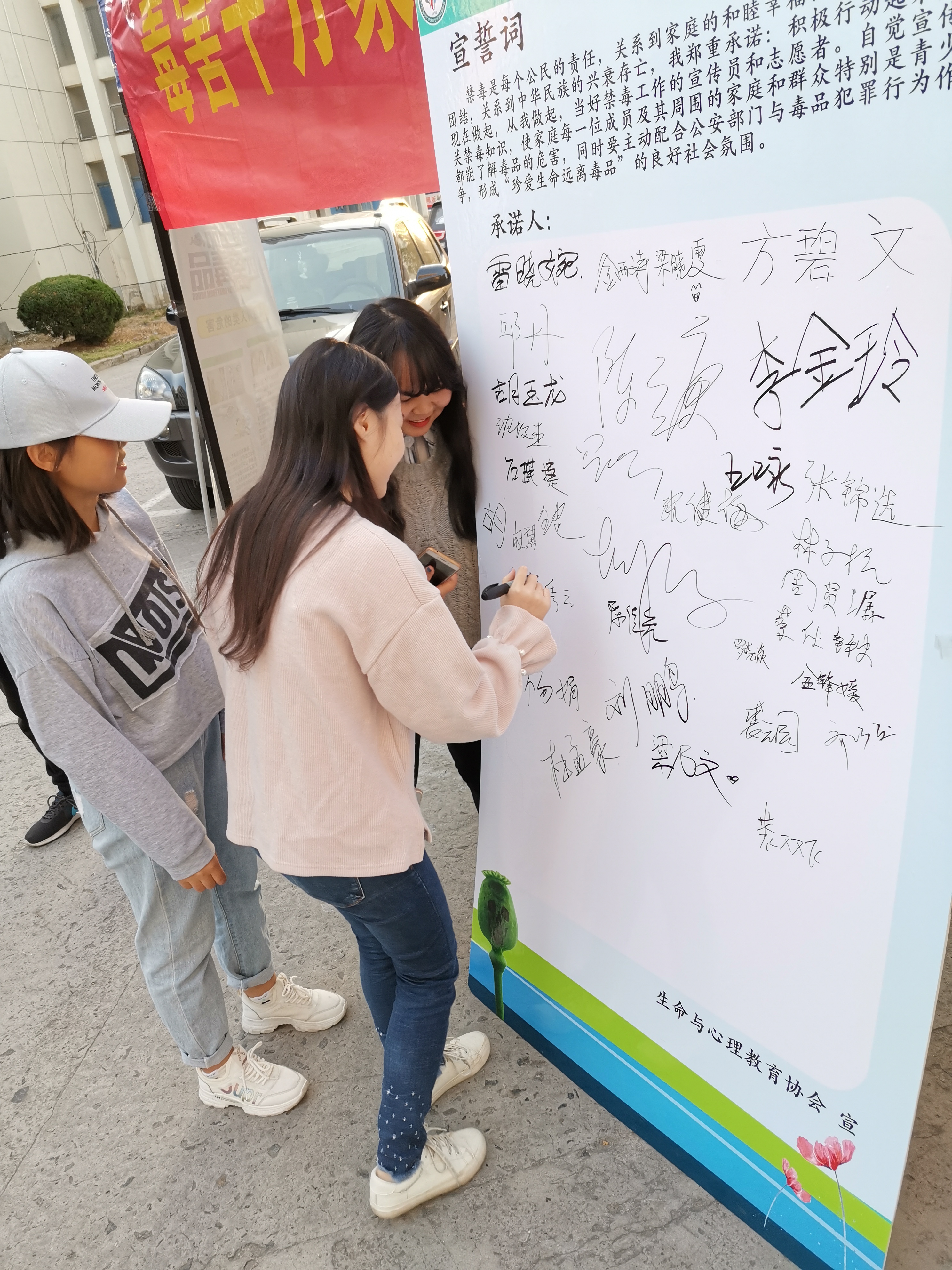 最后,活动在A区A综楼下展开。由于靠近食堂并且接近饭点,周围人流量非常之大,这极大地促进了我们宣传工作的展开。在求得他们同意的情况下,许多同学都在禁毒承诺书上签下了自己的名字,以此表示对此次活动的支持同时体现了对此次活动有所收获。
