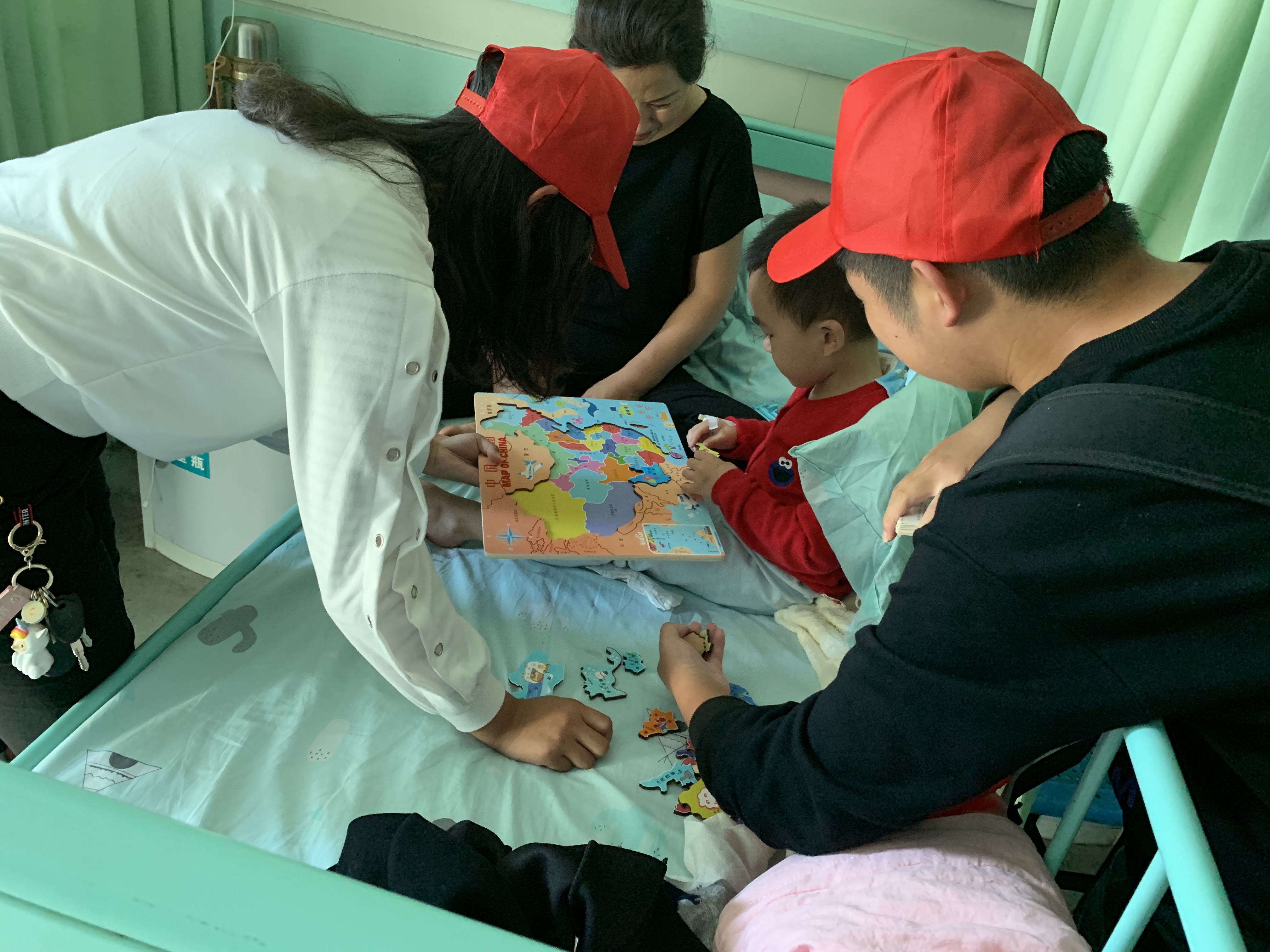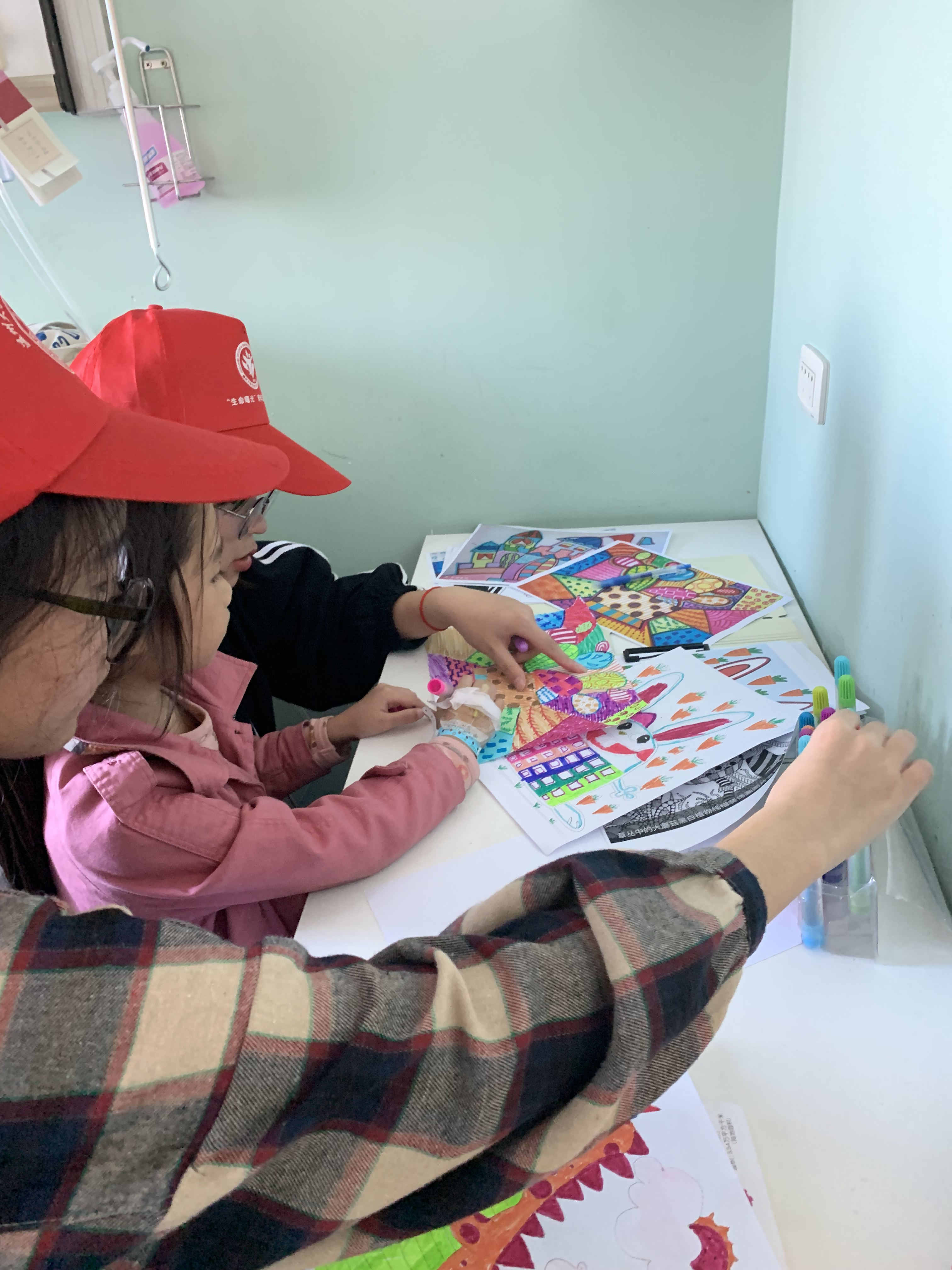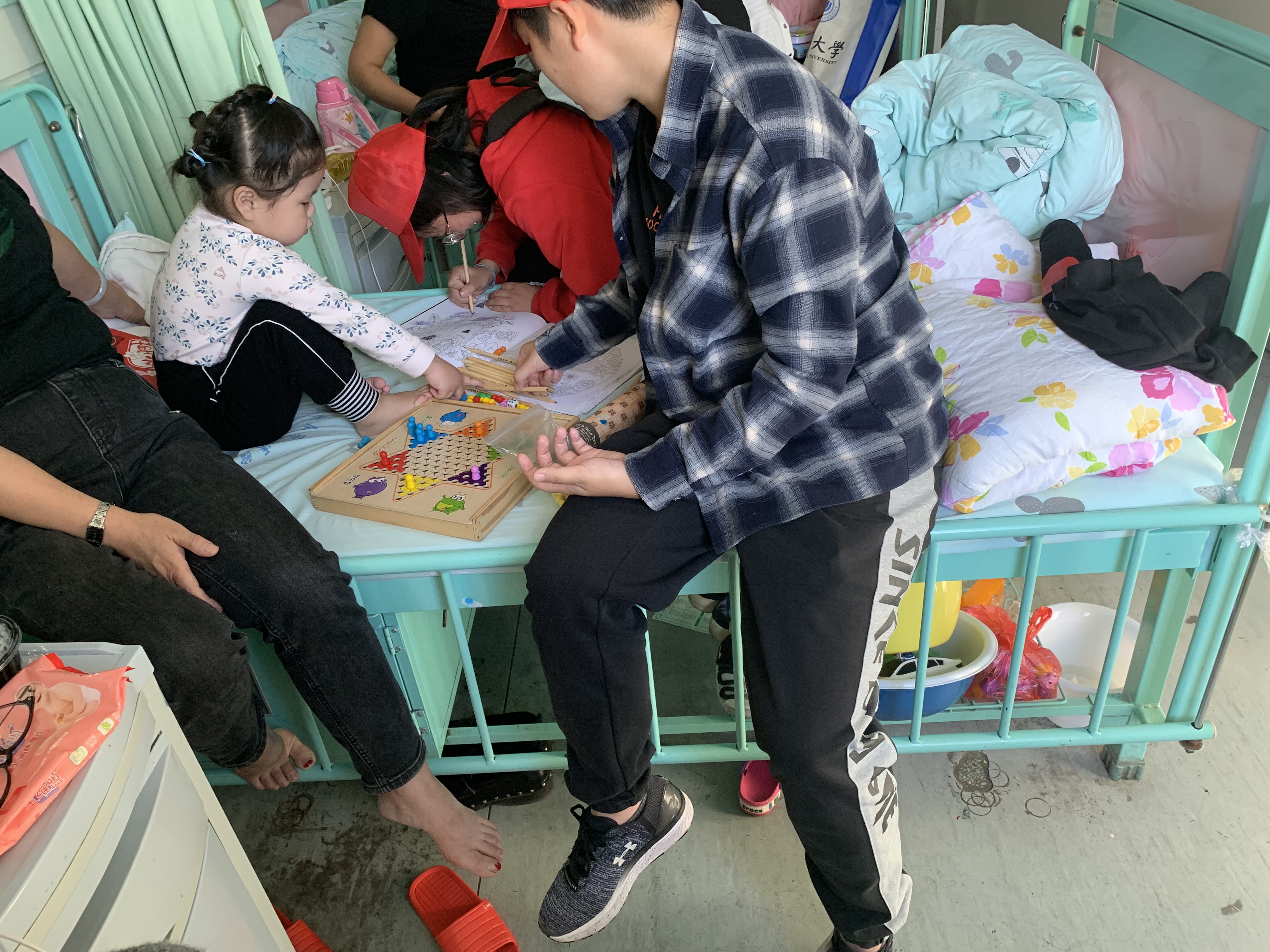 12:50左右,志愿者们满怀期待相聚于温大南门,在完成“志愿汇”签到后,步行至公交车站乘坐40路公交车前往附二医。到达附二医,经由护士姐姐的协助,志愿者们自行选取陪护材料,有序分组进入病房陪护。简单的寒暄,永恒的微笑,一下子就拉近了彼此的距离。志愿者们带领着孩子下飞行棋、五子棋,和孩子一起拼图,教孩子绘画填色。本着教乐同行的理念,志愿者在和孩子嬉戏的过程中,训练其认色能力,渗透地理知识,传达人生感悟。时间飞快,在结束之际,孩子们还意犹未尽。