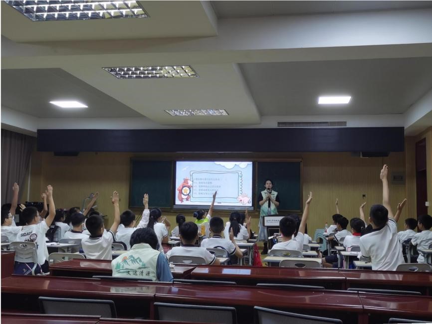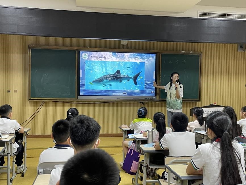 上午8:30,赵亿晶同学给学生带来有关海洋环境保护的主题宣讲活动。她以海洋系列小提问为导入,与学生互动,课堂气氛活跃;以科普视频为延伸,讲解了海洋底栖动物、浮游生物、游泳动物的特点,激发学生们的兴趣;以形象图片为载体,介绍了各种海洋濒危动物,呼吁学生们保护海洋珍稀动物。经过短暂的课间休息,由殷一卜同学开展教学活动。她以知识竞赛的形式,精心设计题目,通过抢答环节和积分制度吸引了大批学生举手回答;学生的踊跃发言将课堂气氛一时烘托至高潮。知识竞赛不仅向同学们科普了海洋生物的知识点,也将丰富有趣的海洋生物现象展现给他们,从而让他们更好地学习海洋生物知识和保护理念。