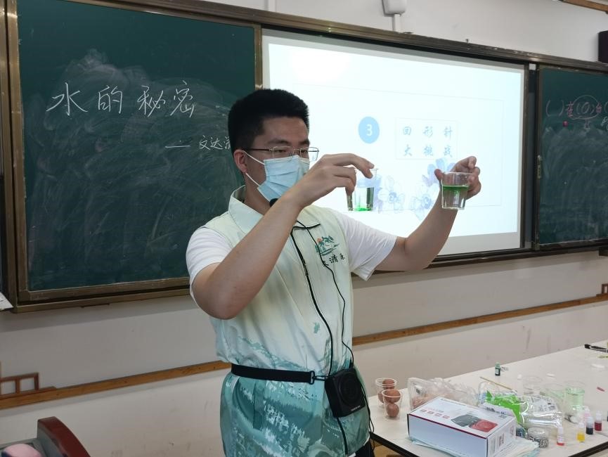 下午14:00,实验组的成员首先对孩子们进行了关于水秘密实验的问卷调查。在了解了学生的大致情况后,由蔡正阳同学进行了正式的授课。本次课程总共演示了三个实验。第一个实验为水中悬蛋小实验,通过往水里加盐让原本沉在水底的鸡蛋浮到水面,形象地说明不同密度的液体具有不同的浮力;第二个实验为色素的扩散,通过色素的扩散速度的不同证明不同温度液体密度的不同;第三个实验为回形针大挑战,让小朋友们往满水的杯子里加回形针,杯子中的水不仅没有溢出,还“吃”下了好多回形针,解释了水的张力原理。课程进行过程中,孩子们积极提问,参与其中,动手操作,学习到了很多关于水的知识。